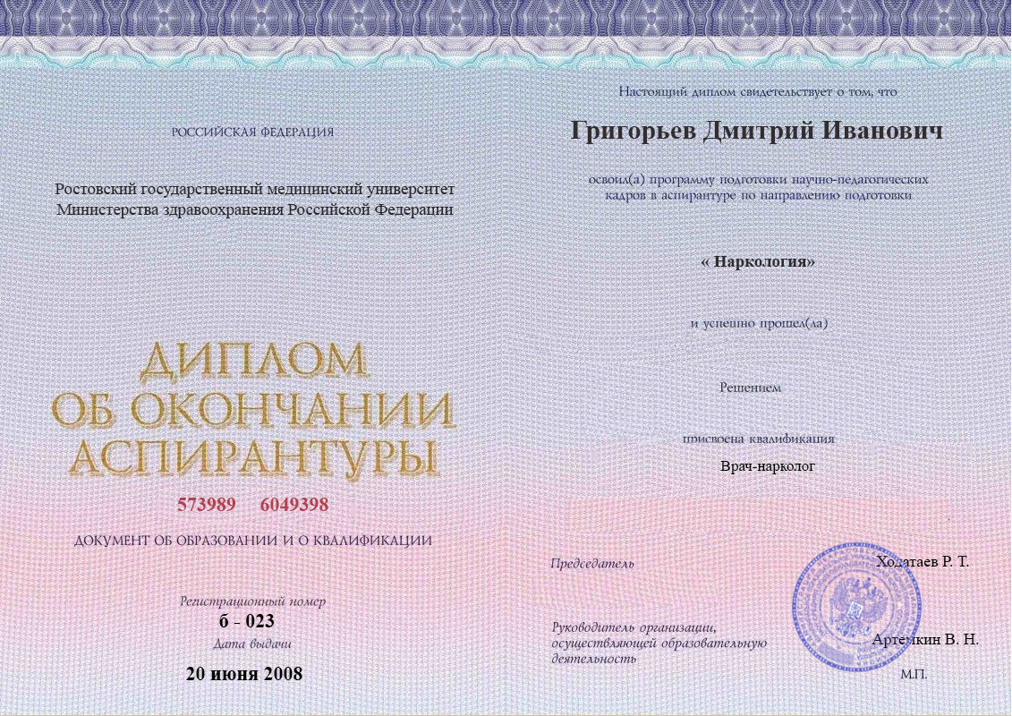 • Переподготовка и повышение квалификации в Ростовском государственном медицинском университете по направлению лечения зависимостей от химических веществ.