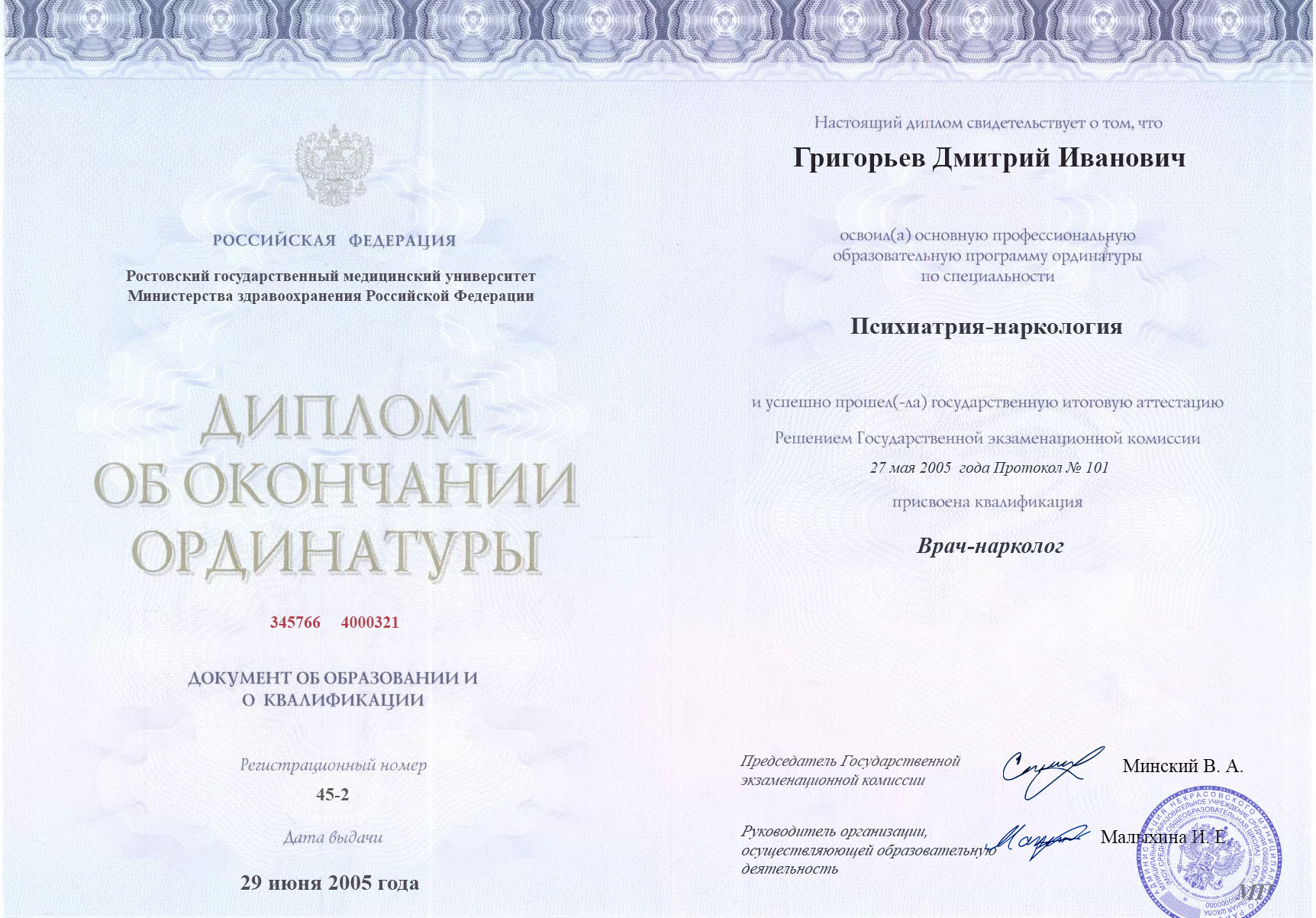 Диплом об окончании ординатуры Григорьева Дмитрия Ивановича
